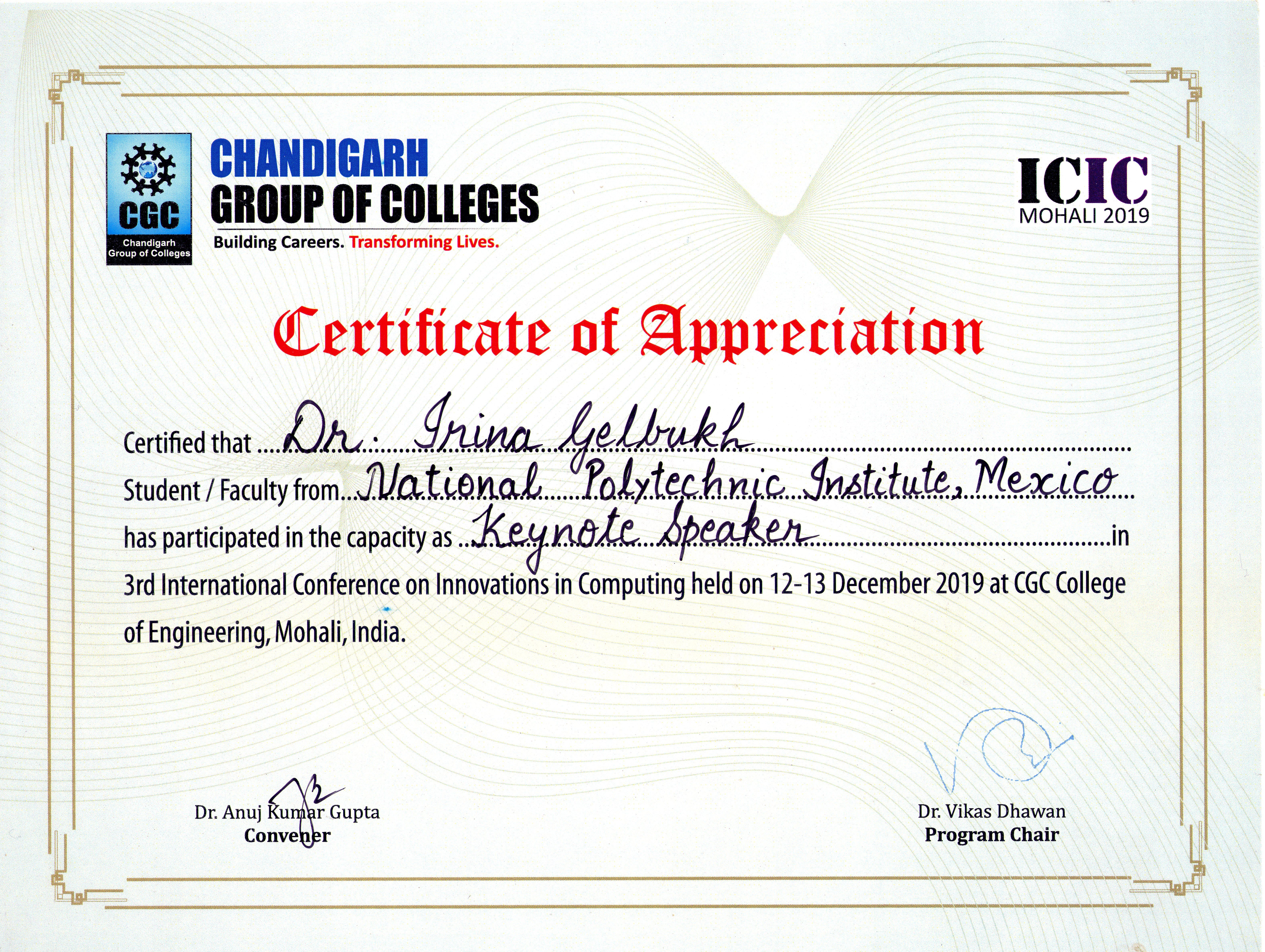 3. Irina Gelbukh. Keynote talk. 3rd International Conference on Innovations in Computing, CGC College of Engineering, Mohali, Punjab, India, 12–13 December 2019.